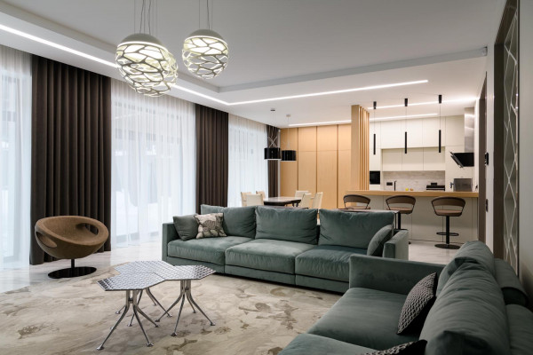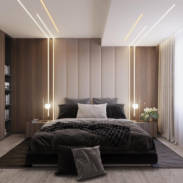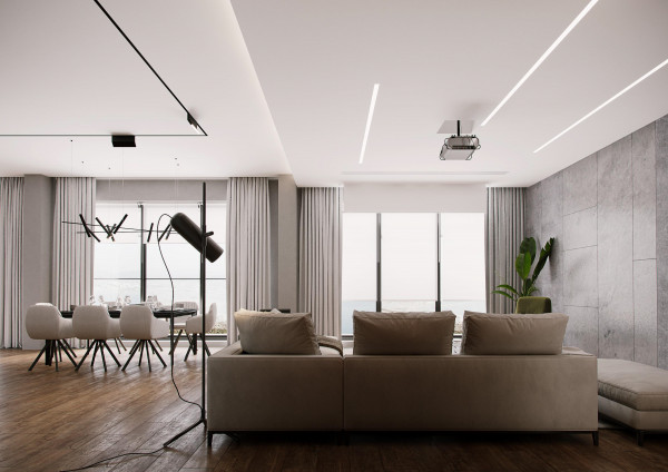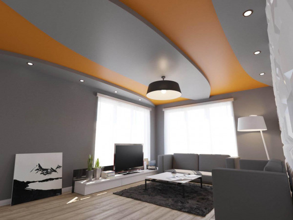 Двухуровневая конструкция решит сразу несколько задач: освещения, зонирования, декорирования черновой поверхности.
