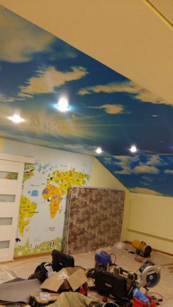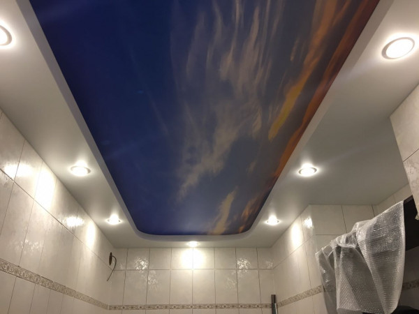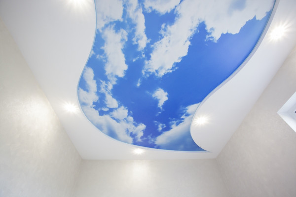 Натяжные потолки в виде неба с облаками украсят собой гостиную, детскую, ванную или любое другое пространство вашего дома. Они одинаково хороши и на ткани, и на поливинилхлоридной пленке, со встроенном освещением, спотами, классическими люстрами.