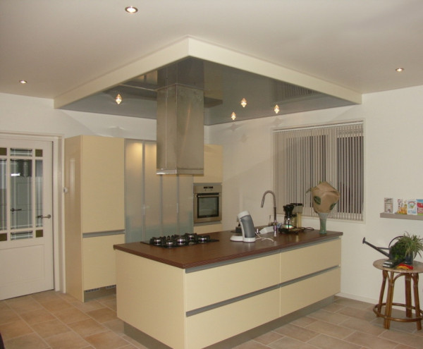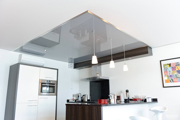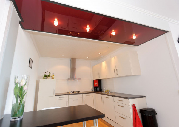 Далеко не все варианты потолочных покрытий могут использоваться в кухне. Одним из оптимальных станет натяжной потолок – он является влагостойким и достаточно прочным, не требует длительной уборки. На такой поверхности не будет скапливаться жир или другие загрязнения, благодаря чему потолок всегда будет оставаться чистым и привлекательным. По необходимости его можно протереть сухой или влажной салфеткой – никаких других действий не потребуется.