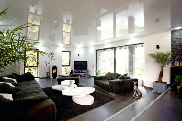 Двухуровневая конструкция решит сразу несколько задач: освещения, зонирования, декорирования черновой поверхности.