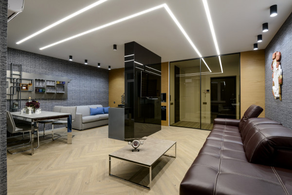 Натяжные потолки со световыми линиями хороши в любом интерьере. Есть несколько возможностей создать полосы света на потолочной поверхности и каждый хорош по своему.