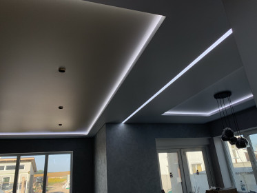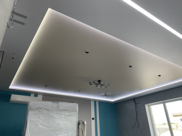 Двухуровневые и многоуровневые потолки зонируют пространство, особенно со встроенной светодиодной подсветкой. Для этого ленту достаточно установить по контуру уровня. Конечно, м2 такой конструкции обойдется дороже, но это зависит и от размера комнаты.